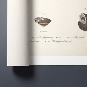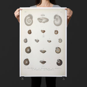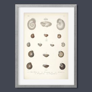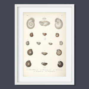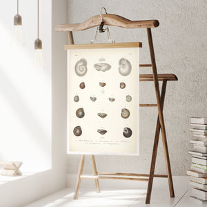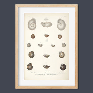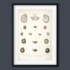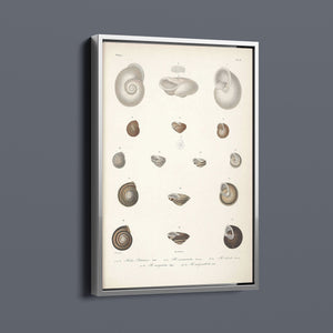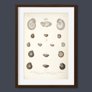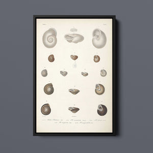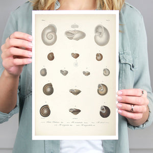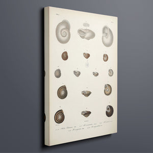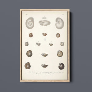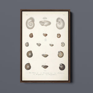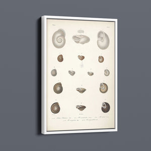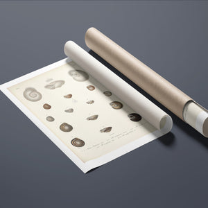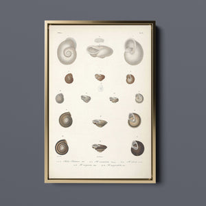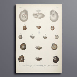 "Vintage Seashells" showcases a collection of beautifully detailed scientific illustrations of various mollusks, including snails and gastropods. This vintage art piece highlights the intricate designs and textures of each shell, presented in a timeless sepia tone that evokes a sense of nostalgia and appreciation for natural history. Perfect for lovers of marine life and vintage decor, this artwork offers a glimpse into the fascinating world of taxonomy and biological diversity.