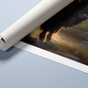 "Wading for the Sun to Rise" showcases a buffalo standing by a peaceful stream in the Rocky Mountains. The painting embodies the essence of Western wildlife with its portrayal of the buffalo’s majesty and the golden light of dawn casting a warm glow over the rugged, outdoor scenery.