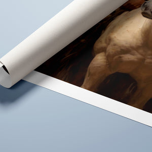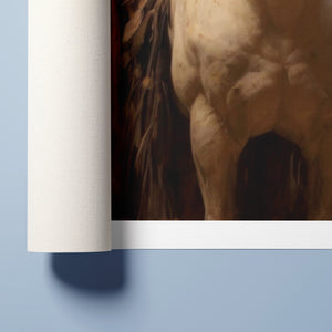 "War Horse" presents a striking portrait of an American Indian brave mounted on a horse, dressed in traditional attire and a feathered headdress. This painting honors the valor and cultural pride of Native American warriors, reflecting their historical significance and tribal heritage.
