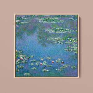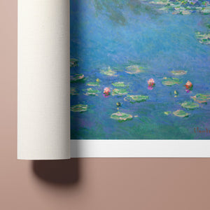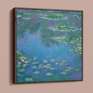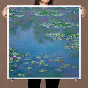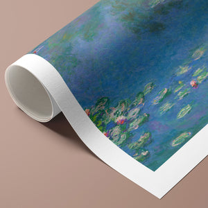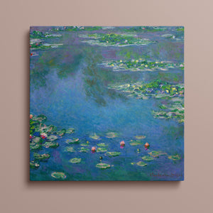 Impressionist painting "Water Lilies 1906" by Claude Monet, featuring a serene pond with vibrant lilies, reflections in soft blue and green tones, and a tranquil, harmonious garden scene.