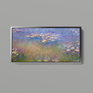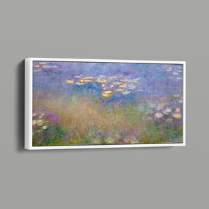Claude Monet's vibrant impressionist painting of water lilies in bright colors, capturing reflections on a tranquil pond.