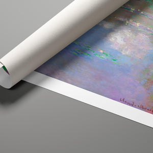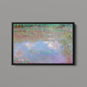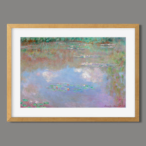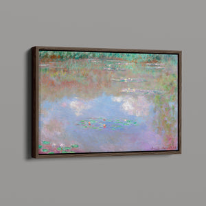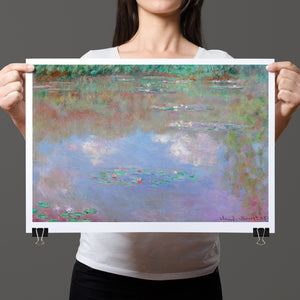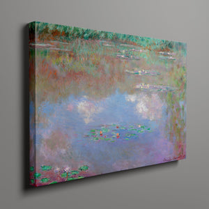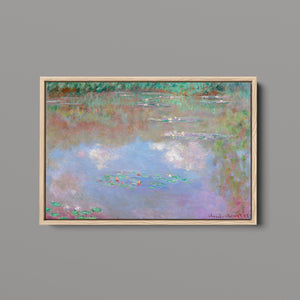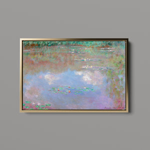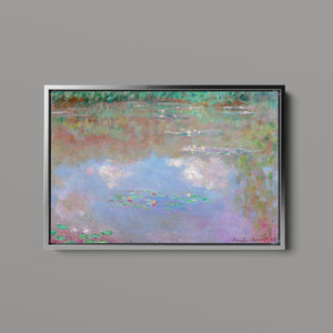"Nympheas" by Claude Monet captures the enchanting beauty of water lilies in a serene pond setting. This horizontal Impressionist painting is characterized by its lush blues and greens, depicting a tranquil water surface adorned with lily pads and blossoms. Monet’s use of impasto technique and pastel colors creates rich textures and reflections that enhance the painting's sense of depth and tranquility. The artwork evokes the organic forms and serene ambiance of Monet’s Giverny garden, highlighting his mastery of capturing the delicate interplay of light and water in a botanical landscape.