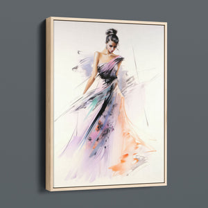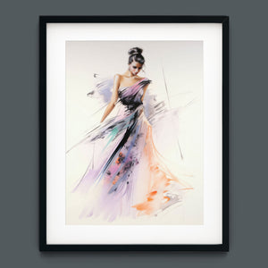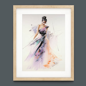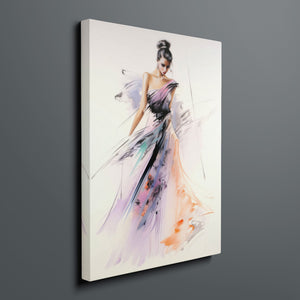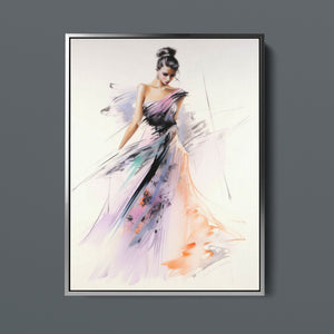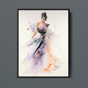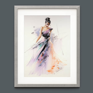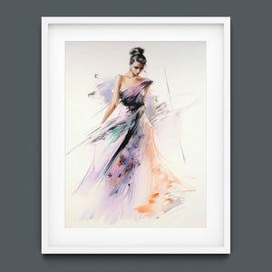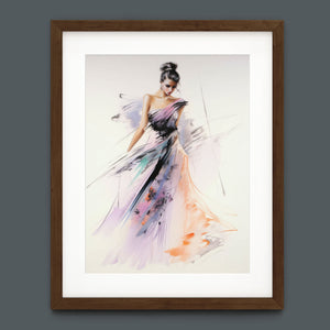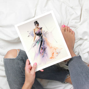 "Watercolor Fashion Illustration - Ball Gown" depicts a graceful woman in a vibrant and dynamic ball gown, with abstract and artistic elements in orange, black, purple, and white.