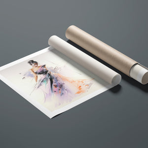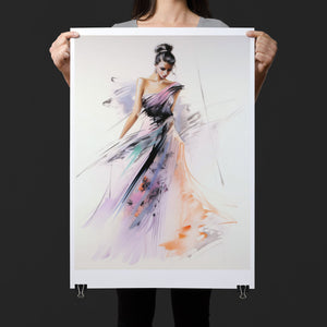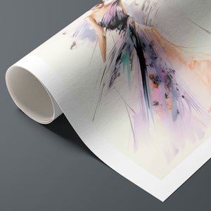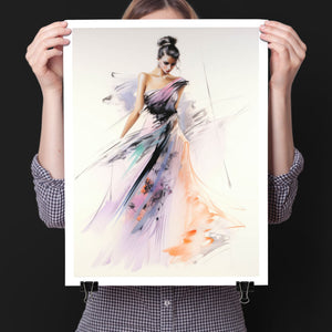 Explore the "Watercolor Fashion Illustration - Ball Gown," a vibrant artwork showcasing a graceful woman in a dynamic and colorful ball gown. This piece combines elegance and modern style with abstract, artistic flair.