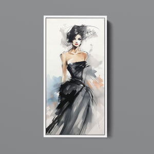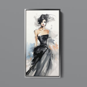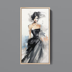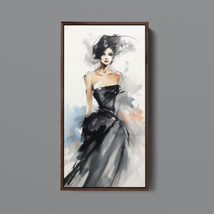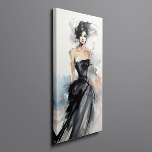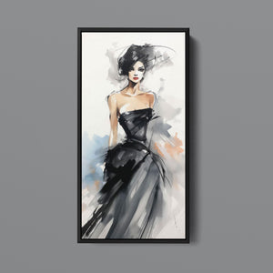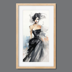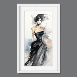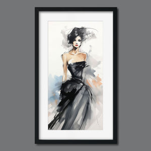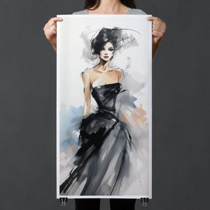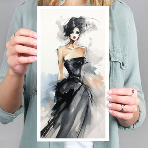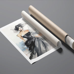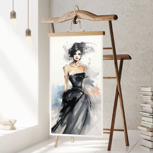 "Watercolor Fashion Illustration - Black Dress" is a stunning portrayal of modern elegance, featuring a sophisticated woman draped in a chic black dress. This captivating artwork combines elements of minimalism and glamour, enhanced by an abstract background in soft shades of beige, blue, and white. The delicate watercolor technique beautifully captures the flowing fabric and refined silhouette, while the stylish hat adds a touch of trendiness to the composition. This piece embodies the essence of haute couture, making it a perfect addition to any contemporary art collection.