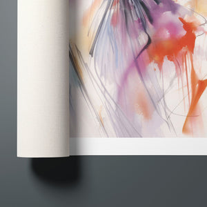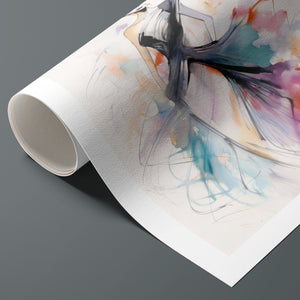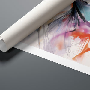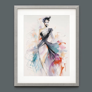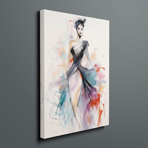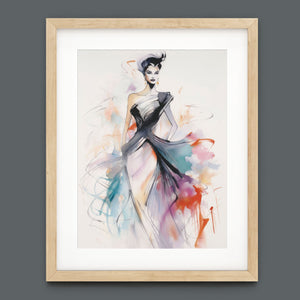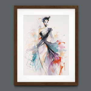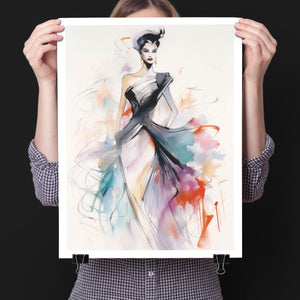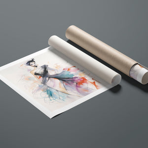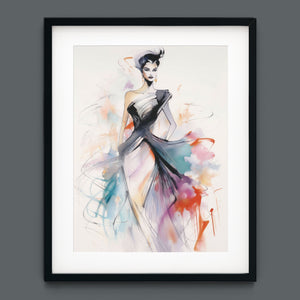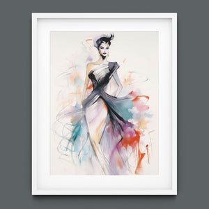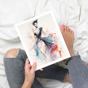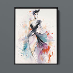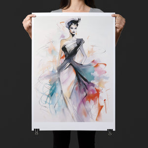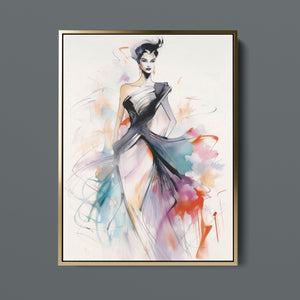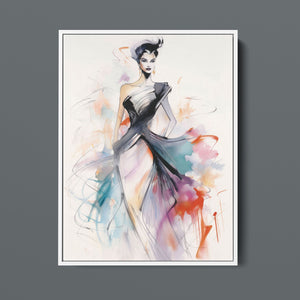 Discover "Watercolor Fashion Illustration - Color Rush," featuring a dynamic and elegant woman in a vibrant dress. This piece blends haute couture with whimsical, abstract art in a striking mix of multicolor hues.