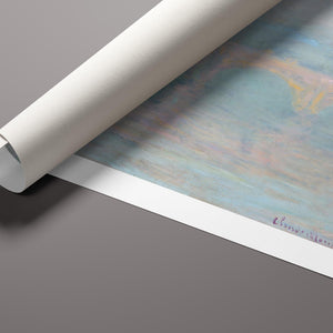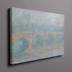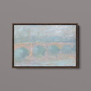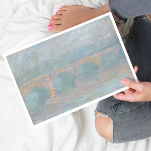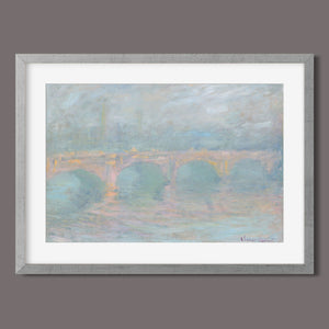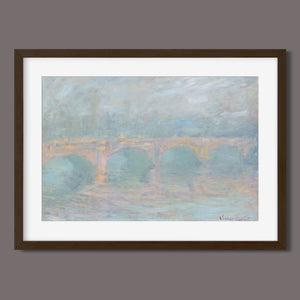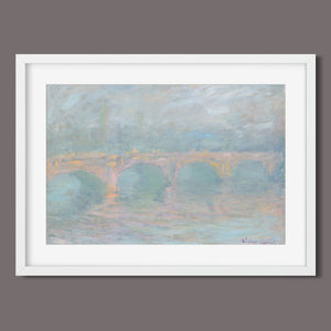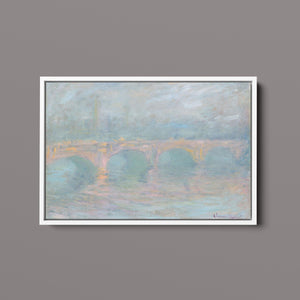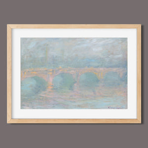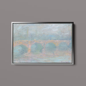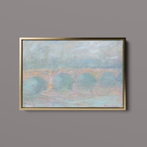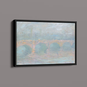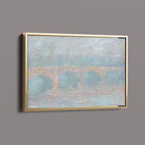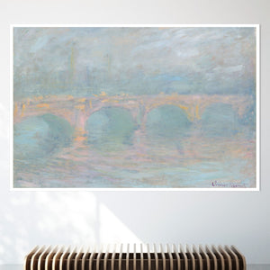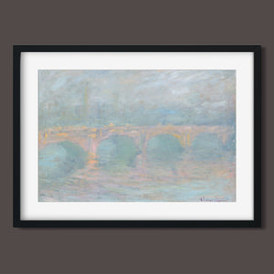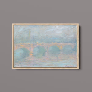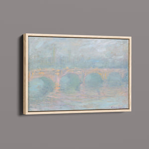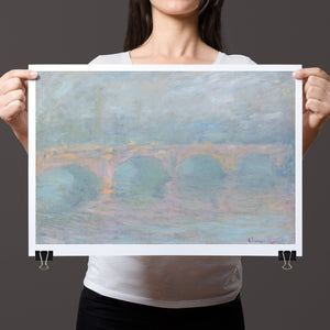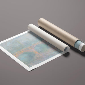 "Waterloo Bridge London at Sunset" by Claude Monet beautifully depicts the iconic bridge spanning the River Thames in a serene twilight setting. This horizontal Impressionist painting showcases Monet’s characteristic use of soft blues, beiges, and whites, capturing the misty atmosphere and delicate reflections on the water. The ethereal quality of the sunset creates a tranquil and atmospheric cityscape, highlighting the bridge’s grandeur against a backdrop of a hazy sky. Monet’s work exemplifies the timeless elegance of London’s architectural and natural beauty.