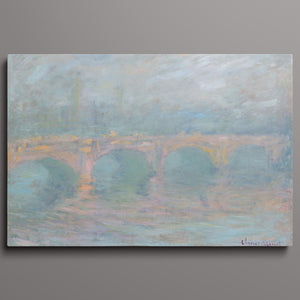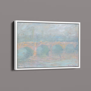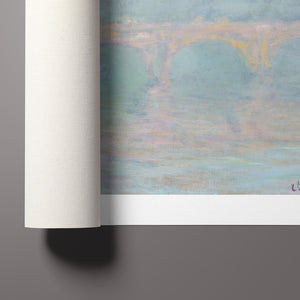 Impressionist cityscape painting by Claude Monet from 1904, featuring Waterloo Bridge at sunset over the River Thames with pastel colors and mist, capturing the serene and ethereal beauty of the iconic London landmark.