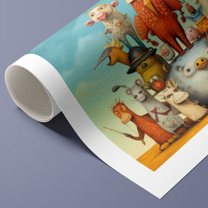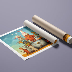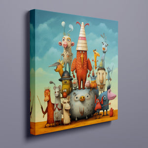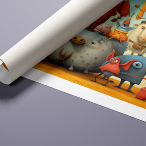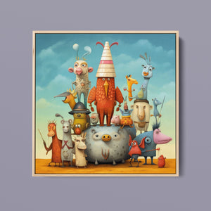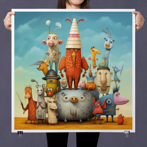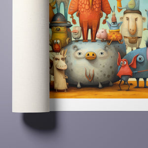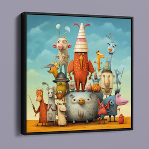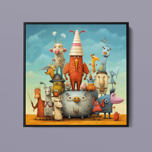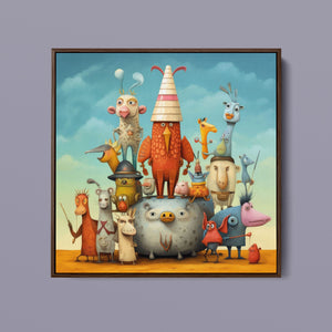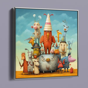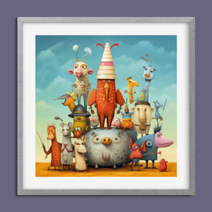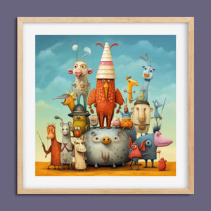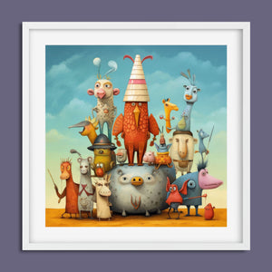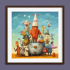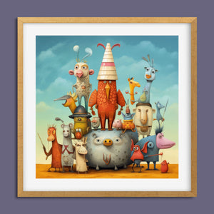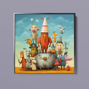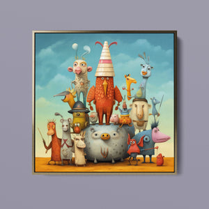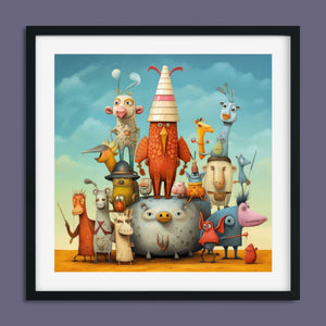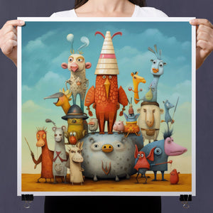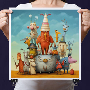 Delight in the vibrant and whimsical "Whacky Animal Family," where colorful, anthropomorphic creatures come together in a joyful, surreal scene. This playful illustration captures the essence of imaginative fantasy art, making it a perfect addition to any space that celebrates creativity and humor.