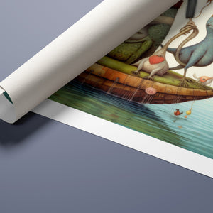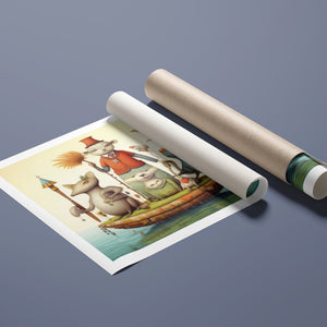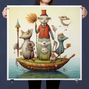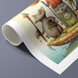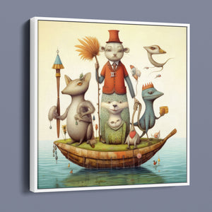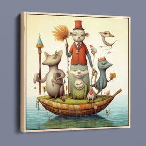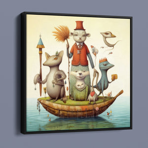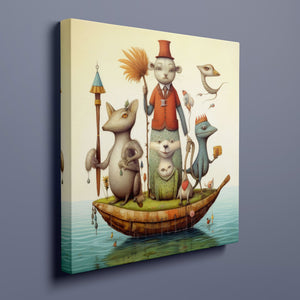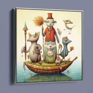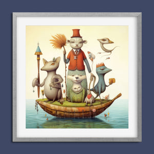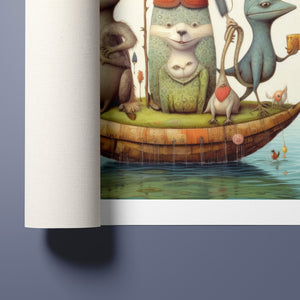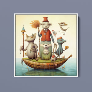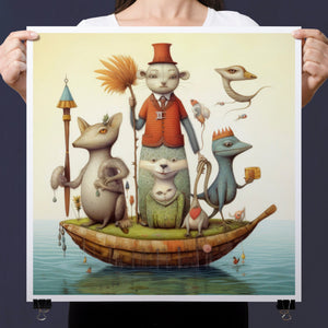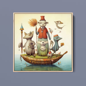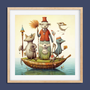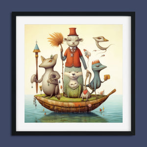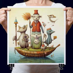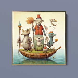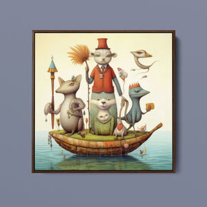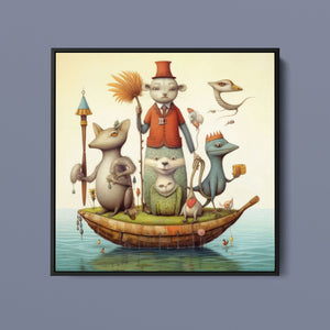 Set sail with a quirky family of anthropomorphic animals on a whimsical boat ride. This delightful illustration brings together a mouse, cat, fox, and fish, all dressed up for a fantastical adventure. With warm tones and light-hearted storytelling, this artwork captures the essence of fun and creativity, perfect for adding a touch of whimsy to any space.