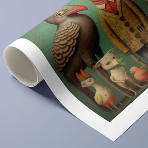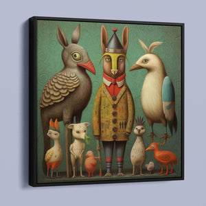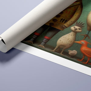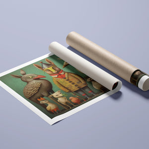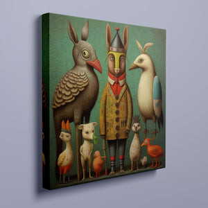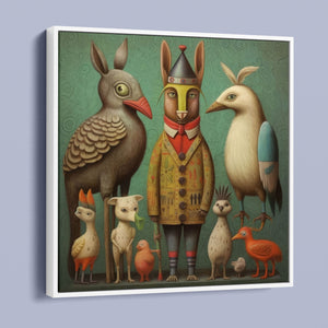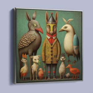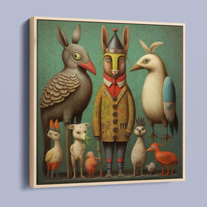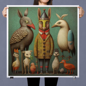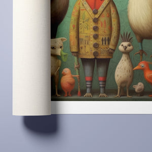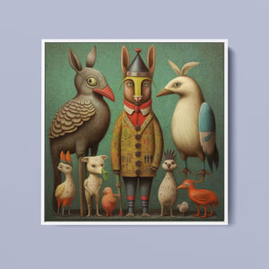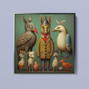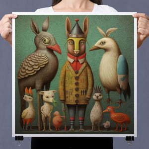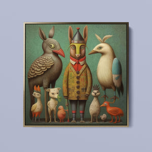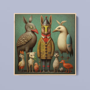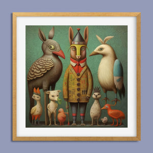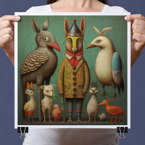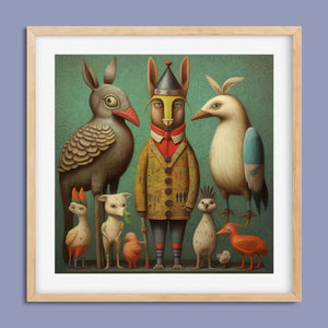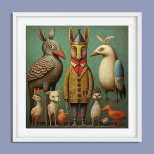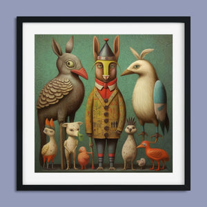 Dive into a whimsical woodland world with this playful illustration of quirky, anthropomorphic forest animals. Featuring a colorful group of eccentric creatures like a bird, dog, and snail, all dressed in unique uniforms, this artwork brings a touch of fantasy and humor to the mystical forest setting. Perfect for adding a dash of imagination and fun to any space.