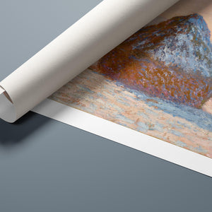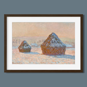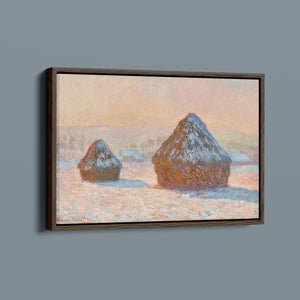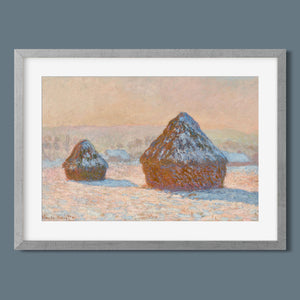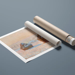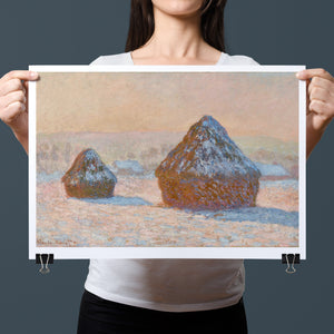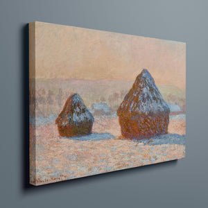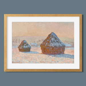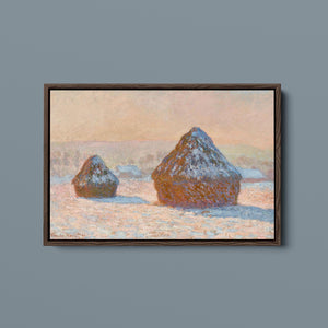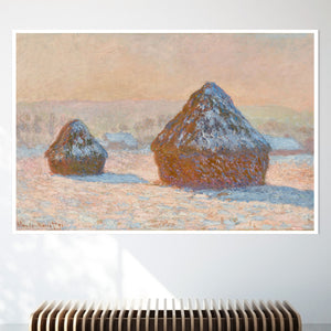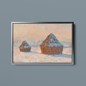 "Wheatstacks - Snow Effect - Morning" by Claude Monet captures the serene beauty of a winter morning in the countryside. This horizontal painting features Monet’s signature Impressionist style, showcasing haystacks blanketed in snow under the soft light of dawn. The muted tones of rose gold, beige, and white convey the tranquil and frosty atmosphere of winter, with delicate brushwork capturing the gentle texture of the snow and the subtle play of sunlight. Monet’s portrayal of the winter landscape reflects a quiet and serene moment in the agricultural cycle.