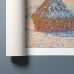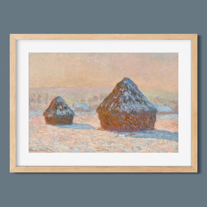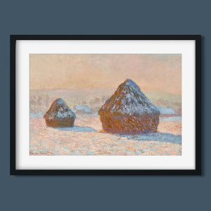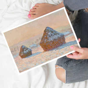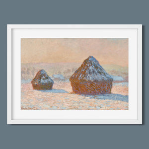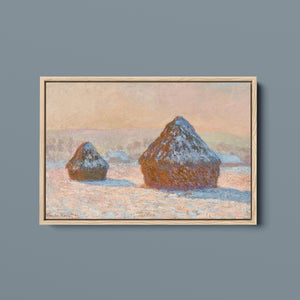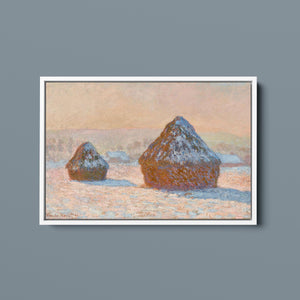 Impressionist winter landscape painting by Claude Monet, featuring snow-covered haystacks at dawn with muted rose gold, beige, and white tones, capturing the tranquil and frosty beauty of the morning countryside.