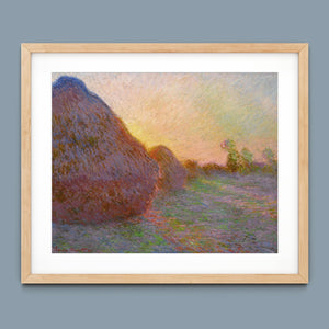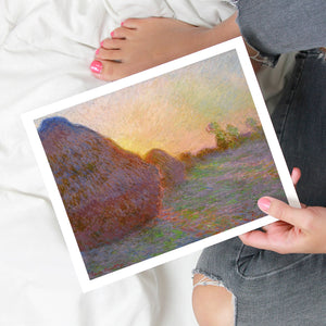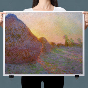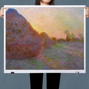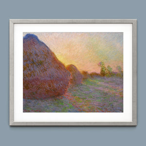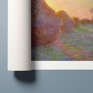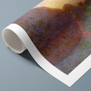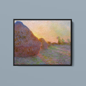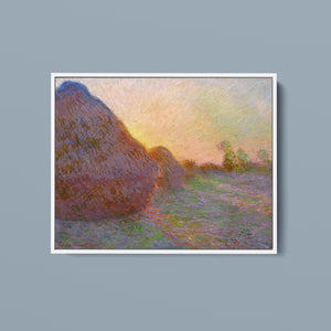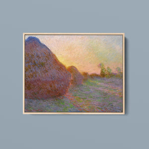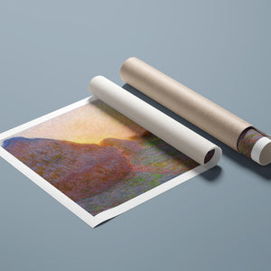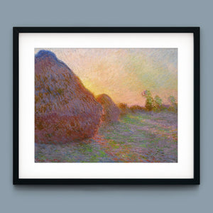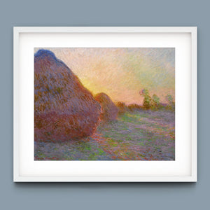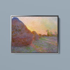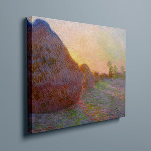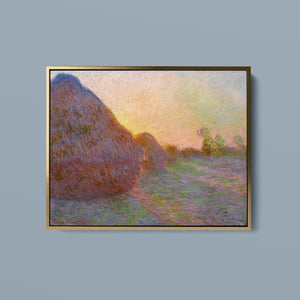 "Wheatstacks at Sunset" by Claude Monet, painted in 1891, is a celebrated piece from Monet’s series depicting the changing light on wheat fields. This Impressionist masterpiece captures the serene beauty of the countryside as the sun sets, casting warm, golden hues across the landscape. Monet’s use of color and light is masterful, with vibrant brushstrokes that convey the atmosphere and texture of the scene. The painting reflects Monet’s fascination with how light transforms the landscape at different times of day, and it exemplifies his innovative approach to capturing fleeting moments in nature. The work stands as a testament to Monet’s ability to evoke mood and atmosphere through his distinctive style, making it a key example of his contribution to Impressionist art.