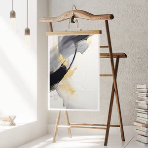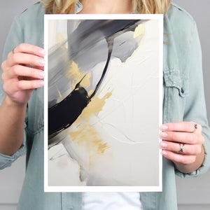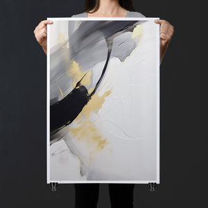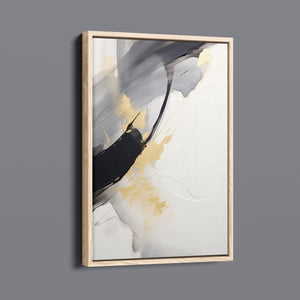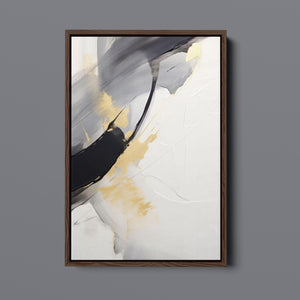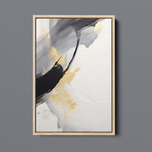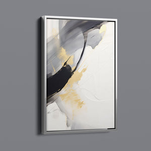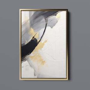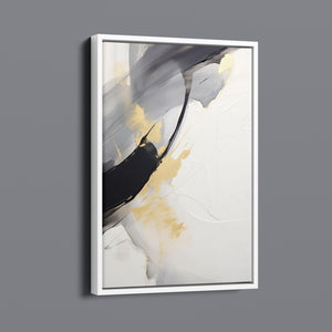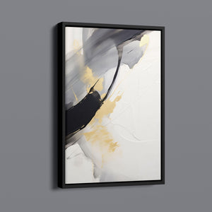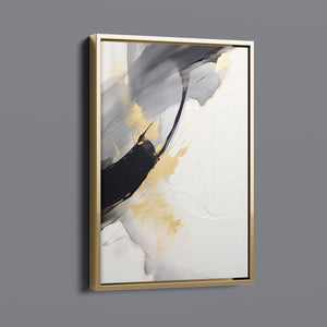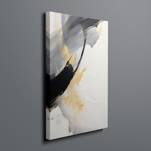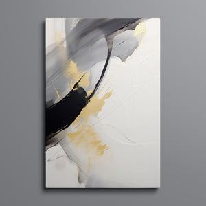 Abstract modern art with dynamic black, white, and gold swirls on a textured canvas.