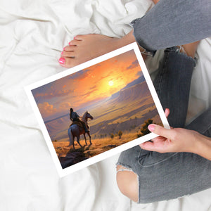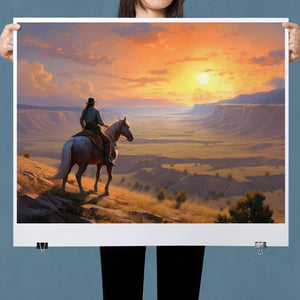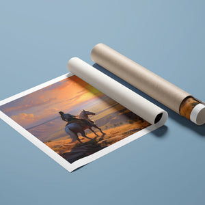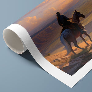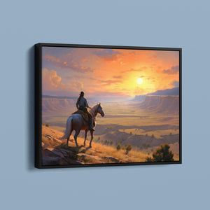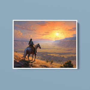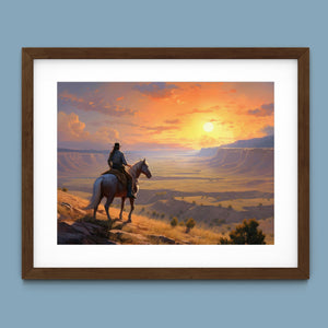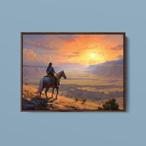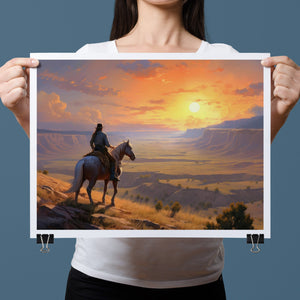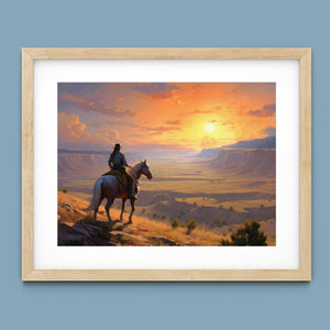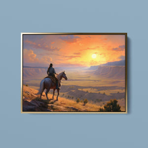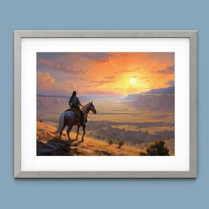 "Whispers of the Frontier" features a rugged cowboy on horseback, set against a breathtaking Western sunset. This artwork highlights the cowboy’s lone presence amidst the expansive plains and prairie, reflecting the vast beauty and solitude of the American West.