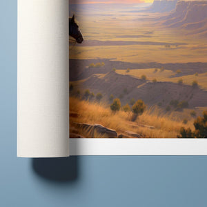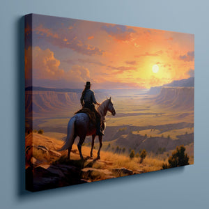 Whispers of the Frontier - Cowboy on Horseback Overlooking a Vast Western Sunset Landscape