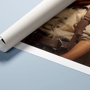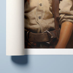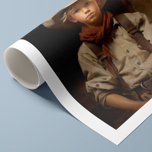"Wild West Whippersnapper" presents a delightful portrait of a young boy in classic cowboy attire. The vintage oil painting highlights the rustic elegance of Western fashion while celebrating the playful spirit of childhood. This artwork is a charming addition to any collection focused on Americana and Western themes.