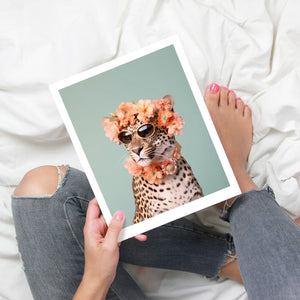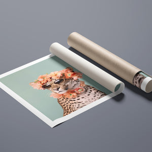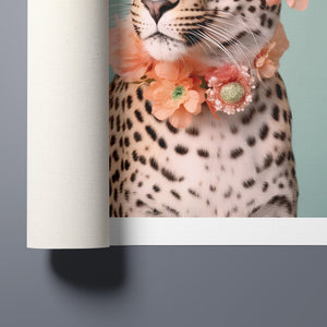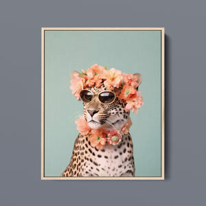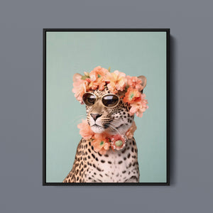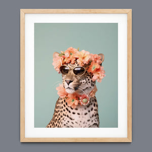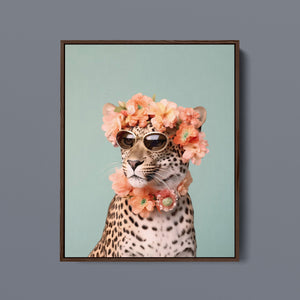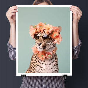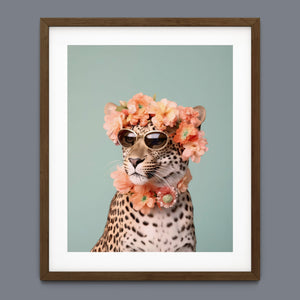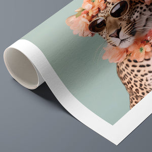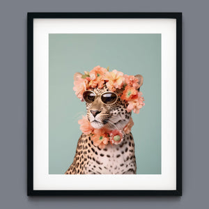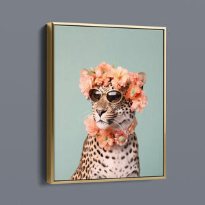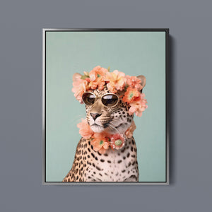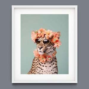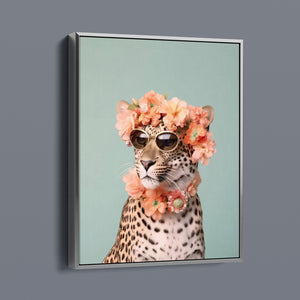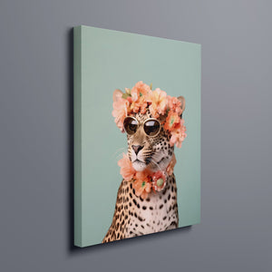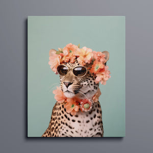 Wildcat Fashion - Fierce but Floral is a chic and playful depiction of a leopard embracing both fierce style and floral elegance. The 3x4 vertical canvas features a leopard adorned with stylish sunglasses and a vibrant floral wreath, set against a mint green background. The artwork combines silver, pink, beige, and brown tones to highlight the leopard’s spotted fur and fashionable accessories. This whimsical and nature-inspired piece captures the essence of summer vibes and trendy fashion, making it a standout addition to any art collection with a flair for playful sophistication.