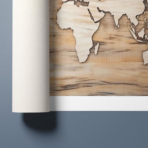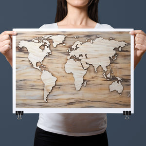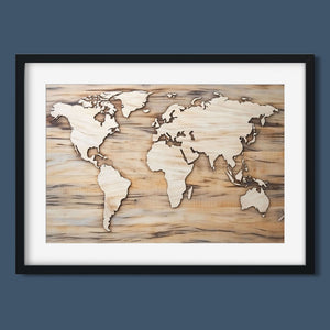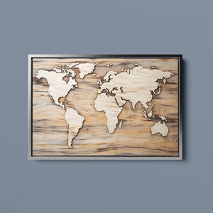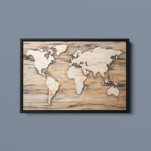 World map artwork featuring carved continents on a wooden background, showcasing intricate craftsmanship in black, brown, and beige tones for a natural and educational decor.