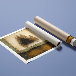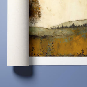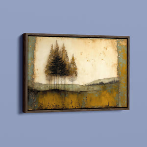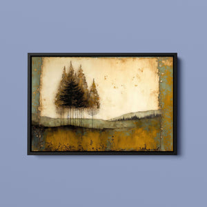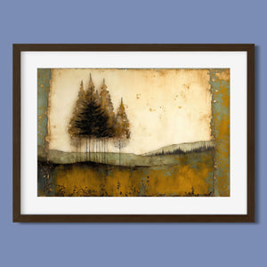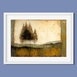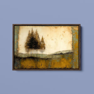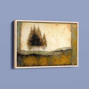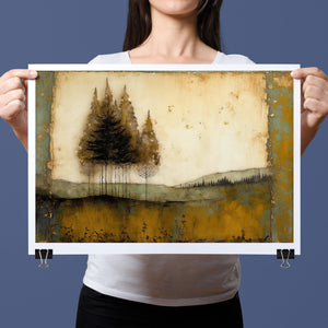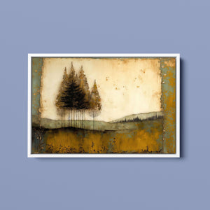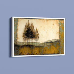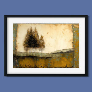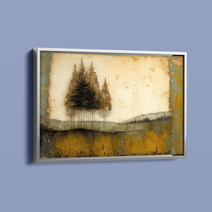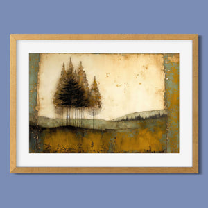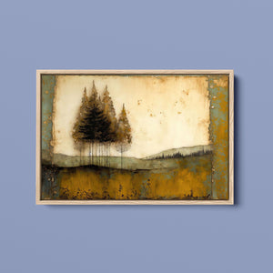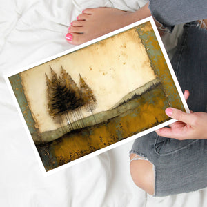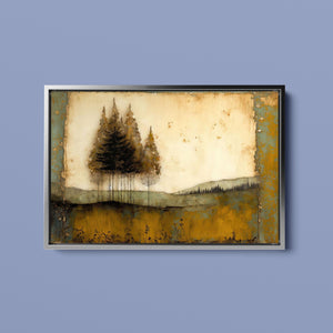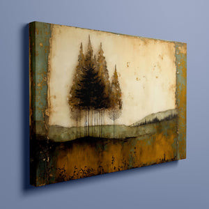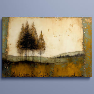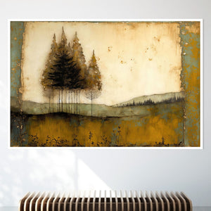 Abstract landscape painting depicting serene trees and rustic scenery in earthy tones, embodying the tranquility and beauty of nature in a calming wilderness setting.