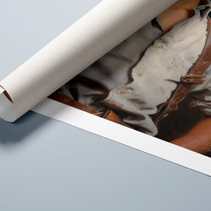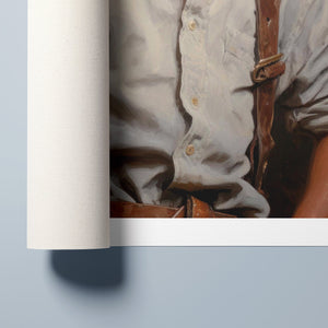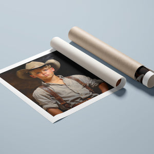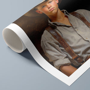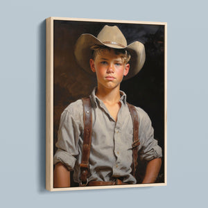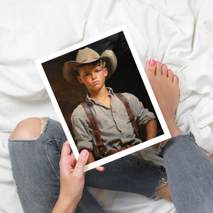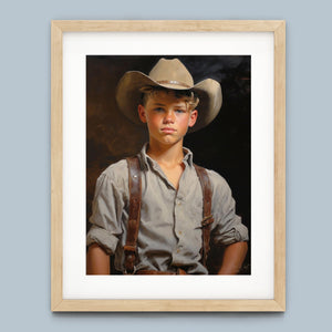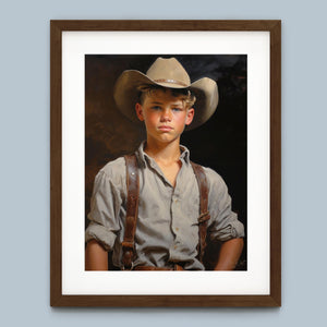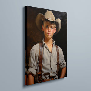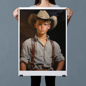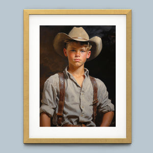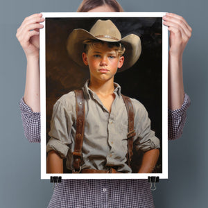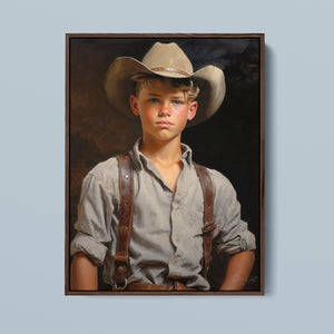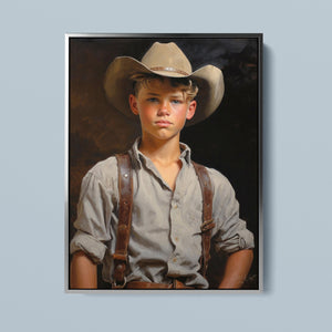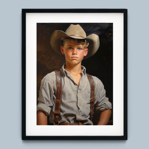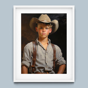 "Young Cowboy" features a delightful portrait of a young boy in classic cowboy gear. The vintage oil painting showcases the rustic charm of Western attire and the innocence of childhood. Perfect for those who appreciate nostalgic Americana and the timeless appeal of Western style.